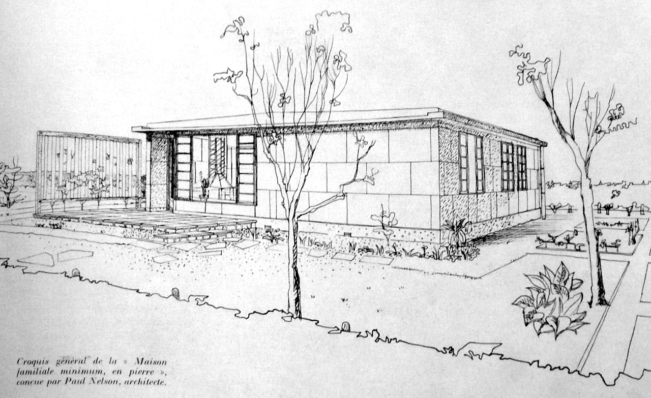 Ceci explique la relative absence des modernes radicaux dans l'Exposition, l'Atelier de Corbu ne présente rien de complet, Jean Prouvé et René Herbst sont absents... Cependant, atypique dans cet évènement où le principe de l'appartement et de l'Immeuble d'Etat s’impose, la maison familiale et minimale de Paul Nelson figure le plan idéal d'un pavillon-type d'une modernité poussée, tout en obéissant strictement aux normes imposées par le MRU. Les auteurs de l'article d'Art et Décoration remarquent en effet que la Suisse et surtout la Suède (Nordiska Kompaniet // Cité de Malmö) réalisent déjà en grande série des pavillons préfabriqués, mais la France est en retard, alors même que les sinistrés demandent des logements d'urgence. Cependant, comme pour les préfabriquées de Jean Prouvé, les coûts de ces pavillons-types ne correspondent pas aux budgets d'un Gouvernement préférant se contenter de baraquements provisoires en bois - suivant les plans de la guerre 1914-1918... Le temps du pavillon "définitif" ne viendra que bien plus tard avec les maisons Courant en 1954. Cependant, dès 1945, le Ministère garde l'idée de réaliser des cités pavillonnaires, suivant une politique oscillant entre la propagande de la périphérie pavillonnaire américaine et les reliquats historiques du modèle patronal des cités-jardins - tout cela dans l'attente improbable d'une initiative privée ou d'une réparation par l'Allemagne : c'est dans ce flou que sont édifiés les 56 pavillons de la Cité expérimentale de Noisy-le-Sec.