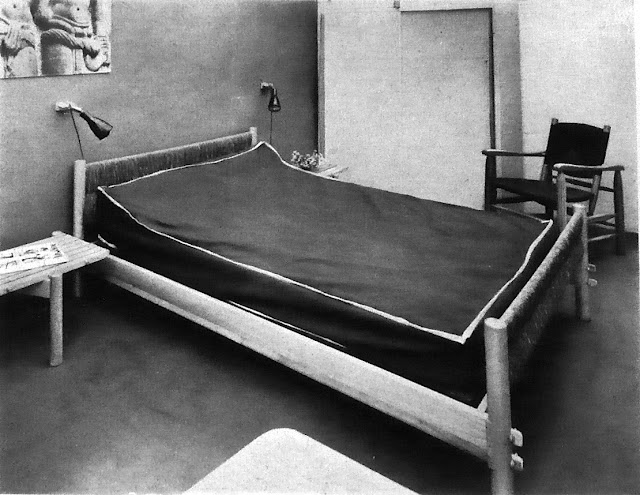 Concernant le mobilier, il correspond aux modèles que Charlotte Perriand dessine avec Pierre Jeanneret dans les années 1930 et déjà bien connus en 1938, figurant notamment dans un aménagement de chambre d’hôtel (lit, chevet), la table et la bibliothèque sont esquissées en 1940 avant d’aboutir en 1945. Le tout est édité à partir de 1947 par « L’équipement de la maison », entreprise grenobloise, mais leur réalisation nécessairement artisanale rend les prix très élevés, voire « un peu effrayant » (J. Barsac, p.273).