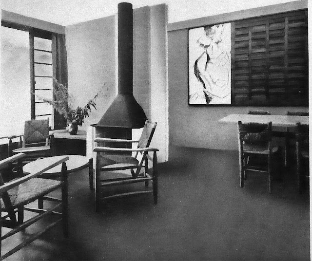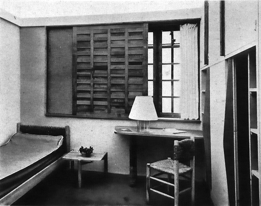 On peut aussi remarquer l'étagère et les panneaux coulissants au niveau des fenêtres, ainsi que les ouvrants qui évoquent l'inspiration "japonaise" de Charlotte Perriand ; celle-ci intervient visiblement très en amont dans le projet architectural - ce qui se présente alors dans très peu de cas, le plus connu étant celui de Gascoin et de Lods pour l'Unité de voisinage de Sotteville-lès-Rouen, alors même que s'annonce (plus ou moins ouvertement) le célébrissime trio Prouvé-Perriand-Corbu dans l'Unité d'habitation.